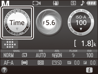 Mens lysmålerne er aktive, skal du dreje kommandohjulet til venstre for at vælge lukkertiden Time (&).