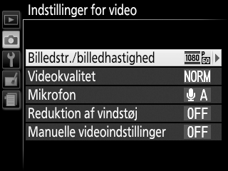 Markér Indstillinger for video i optagemenuen, og tryk på 2.