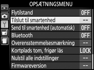 Kamera: Tryk på J. Når sammenkædningen er fuldført, viser kameraet en meddelelse om, at kameraet og smartenheden er tilsluttet. Tryk på J, og følg instruktionerne på skærmen.