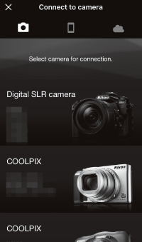 Hvis du startede SnapBridge, før du bliver bedt om det af kameraet, leder SnapBridge dig hen til valg af kameratype i trin 2. Hvis du trykker på den ønskede kameratype, vises en dialogboks, hvor du bliver bedt om at få vist startanmodningen på kameraet; få vist startanmodningen, og fortsæt til trin 3.