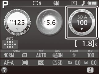 Når Til er valgt, viser søgeren ISO AUTO, og informationsvisningen viser ISO-A. Disse indikatorer blinker, når følsomheden ændres fra den brugervalgte værdi.