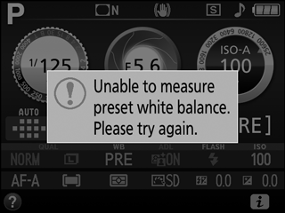 Kui kaamera suutis mõõta valge tasakaalu väärtuse, kuvatakse sellekohane sõnum ning pildiotsijas hakkab vilkuma a ja kaamera naaseb võtterežiimi. Koheselt võtterežiimi naasmiseks vajutage päästik pooleldi alla.