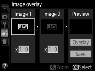 Tõstke retušeerimismenüüs esile Image overlay (Pildi ülekate) ja vajutage 2. Kuvatakse ülekatte valikud esiletõstetud valikuga Image 1 (Pilt 1); vajutage J antud kaameraga loodud NEF (RAW) piltide loendi kuvamiseks.