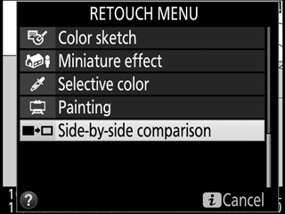 Retušeeritud koopiate võrdlemine originaalfotodega. See valik on kasutatav ainult retušeerimismenüü kuvamisel P nuppu vajutades ja valides Retouch (Retušeerimine) koopia või originaali täiskaadris taasesituse ajal.