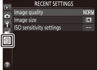 Viimaste sätete menüü kuvamiseks vajutage G ja valige vahekaart m (viimased sätted).
