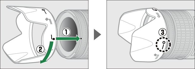 ) vastavalt joonisele q ning pöörake seejärel päikesekaitset (w) kuni märgi ● joondumiseni objektiivi päikesekaitse lukustusmärgiga (—○).