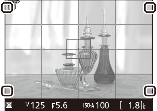 | !2 | Fokusa punkts | Pašreizējais fokusa punkts. Displejs mainās atkarībā no AF apgabala režīmam atlasītās opcijas (0 AF apgabala režīms). |