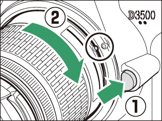 Iekams noņemt vai nomainīt objektīvu, pārbaudiet, vai kamera ir izslēgta. Lai noņemtu objektīvu, turiet nospiestu objektīva atbrīvošanas pogu (q) un vienlaikus grieziet objektīvu pulksteniski (w). Kad objektīvs ir noņemts, uzlieciet objektīva vāciņus un kameras korpusa vāciņu.