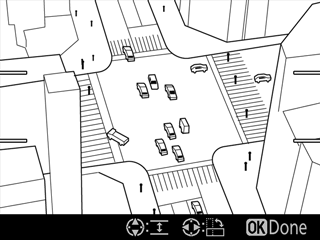 Izmantojiet kursortaustiņu, lai pozicionētu fokusa punktu apgabalā, kas būs fokusā, un pēc tam nospiediet līdz pusei aizvara atbrīvošanas pogu, lai fokusētu. Lai īslaicīgi nodzēstu no displeja miniatūras efekta opcijas un palielinātu ekrānā redzamo skatu, lai precīzi fokusētu kameru, nospiediet X. Nospiediet W (Q), lai atjaunotu miniatūras efekta displeju.