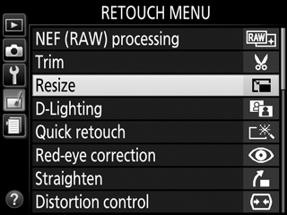 Lai mainītu atlasīto attēlu izmērus, iezīmējiet retušas izvēlnes vienumu Resize (Mainīt izmēru) un nospiediet 2.