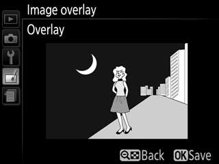 Lai priekšskatītu kompozīciju, nospiediet 4 vai 2, lai ievietotu kursoru ailē Preview (Priekšskatījums); pēc tam nospiediet 1 vai 3, lai iezīmētu opciju Overlay (Pārklāšana), un nospiediet J (ņemiet vērā, ka krāsas un spilgtums priekšskatījumā var atšķirties no galīgā attēla krāsām un spilgtuma). Lai saglabātu pārklājumu, neparādot priekšskatījumu, atlasiet opciju Save (Saglabāt). Lai atgrieztos 4. darbībā un atlasītu jaunas fotogrāfijas vai pielāgotu palielinājumu, nospiediet W (Q).