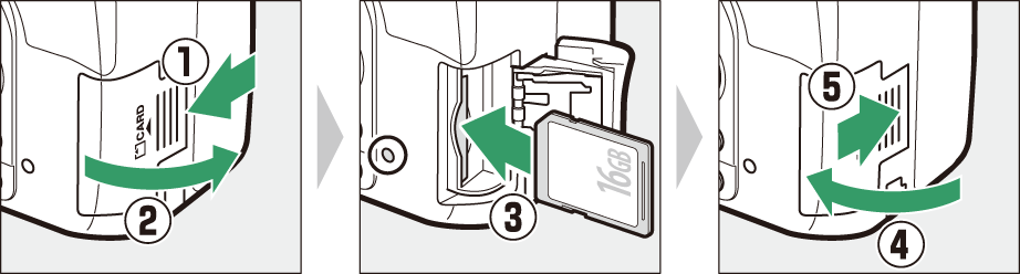 Etter å ha forsikret deg om at lampen for minnekortaktivitet ikke lyser, kan du slå av kameraet, åpne dekslet til minnekortsporet og trykke på kortet for å støte det ut (q). Deretter kan du ta ut kortet for hånd (w).