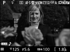 Bruk til portretter. Kameraet oppdager automatisk og fokuserer på portrettmotiver; det valgte motivet angis av en dobbel gul ramme (hvis flere ansikter oppdages, fokuserer kameraet på det nærmeste motivet; bruk multivelgeren hvis du vil velge et annet motiv). Rammen vises ikke lenger hvis kameraet ikke lenger oppdager motivet (for eksempel fordi motivet har vendt ansiktet vekk fra kameraet).