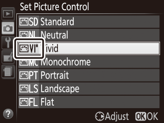 Zvýraznite Picture Control a stlačte tlačidlo J.