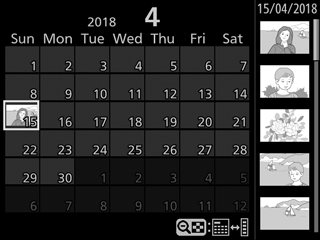 Stlačením W (Q) „oddialite“ zobrazenie z prehrávania snímok na celej obrazovke na zobrazenie miniatúr. Počet zobrazených snímok sa zvýši po každom stlačení tlačidla až na maximálne 72. Ak chcete zobraziť snímky zhotovené v rámci zvolených dátumov, stlačte W (Q), keď sa zobrazí 72 snímok (zobrazenie kalendára).
