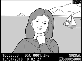 Ak chcete zobraziť fotografie, stlačte tlačidlo K. Na monitore sa zobrazí úplne posledná fotografia. Ďalšie snímky je možné zobraziť stlačením 4 alebo 2; ak si chcete pozrieť ďalšie informácie o aktuálnej fotografii, stlačte 1 alebo 3 (0 Informácie o fotografii). Ak je aktuálna snímka označená ikonou 1 na zobrazenie toho, že ide o videosekvenciu, stlačením J sa spustí prehrávanie videosekvencie (0 Prezeranie videosekvencií).