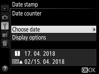 Pri prvej voľbe funkcie Date counter (Počítadlo dátumu) budete vyzvaní na zadanie dátumu do prvého slotu. Pomocou multifunkčného voliča zadajte dátum a stlačením tlačidla J zatvorte zoznam dátumov.