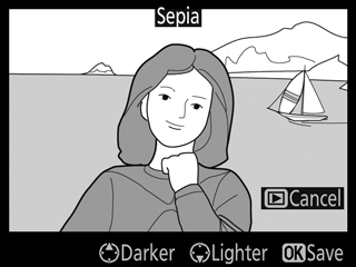 Pri voľbe možnosti Sepia (Sépia) alebo Cyanotype (Kyanotyp) sa zobrazí ukážka vybranej snímky; stlačením tlačidla 1 môžete zvýšiť sýtosť farieb a stlačením tlačidla 3 ju môžete znížiť. Stlačením tlačidla J vytvorte monochromatickú kópiu.
