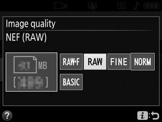 Če za Image quality (Kakovost slike) izberete NEF (RAW), fiksirate Image size (Velikost slike) na Large (Velika) (0 Velikost slike). Date stamp (Datumski žig) (0 Datumski žig) ni na voljo pri nastavitvah kakovosti slike NEF (RAW) ali NEF (RAW) + JPEG.