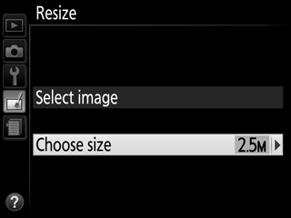 Če želite spremeniti velikost izbranih slik, v meniju za retuširanje osvetlite Resize (Sprememba velikosti) in pritisnite 2.