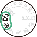 Ako je živi prikaz slike izabran u i ili j režimu, fotoaparat će automatski analizirati subjekat i izabrati odgovarajući režim fotografisanja kada se dugme okidača pritisne do pola za fokusiranje koristeći autofokus. Izabrani režim je pokazan na monitoru.