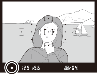 Indikator fokusa u tražilu može da se koristi da bi potvrdio da li je subjekat u izabranoj tački fokusa u fokusu (tačka fokusa može da se izabere između bilo koje od 11 tački fokusa). Nakon što pozicionirate subjekat u izabranu tačku fokusa, pritisnite dugme okidača do pola i rotirajte objektiv prstena za fokusiranje dok se indikator ispravnog fokusa (I) ne prikaže. Imajte na umu da kod subjekata navedenih u „Dobijanje dobrih rezultata sa autofokusom“ (0 Dobijanje dobrih rezultata sa autofokusom), indikator ispravnog fokusa može ponekad biti prikazan kada subjekat nije u fokusu; potvrdite fokus u tražilu pre nego što fotografišete.