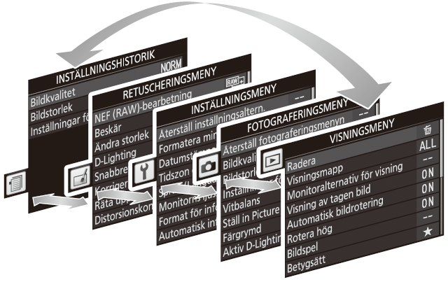 Du kan nå de flesta fotograferings-, visnings- och inställningsalternativen via kamerans menyer. Tryck på G-knappen för att visa menyerna.
