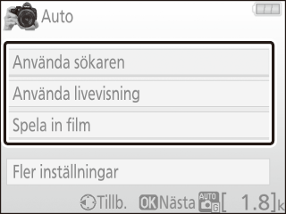 Om Fler inställningar visas kan du markera detta alternativ och trycka på 2 för att komma åt följande inställningar (vilka inställningar som är tillgängliga beror på vilket fotograferingsalternativ som valts):