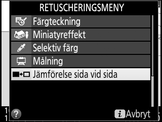 Välj en retuscherad kopia (visas av en Z-ikon) eller ett fotografi som har retuscherats i helskärmsläge. Tryck på P, markera sedan Retuschering och tryck på 2.