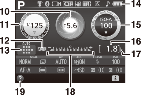 | !3 | Індикатор експозиції | Показує, чи буде знімок недо- або переекспонованим за поточних параметрів (тільки для режиму M; 0 Індикатор експозиції). |