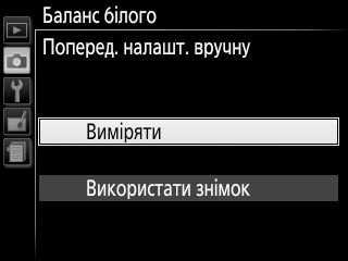 Фотокамера може одночасно зберігати тільки одне значення попереднього налаштування балансу білого; поточне значення буде замінено в разі вимірювання нового значення. Зауважте, що експозиція автоматично збільшується на 1 EV під час вимірювання балансу білого; якщо зйомка виконується в режимі M, налаштуйте експозицію таким чином, щоб індикатор експозиції показував значення ±0 (0 Індикатор експозиції).