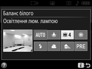 Параметр I Освітлення люм. лампою в меню Баланс білого можна використовувати для вибору типу джерела світла з різних видів ламп.