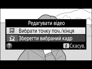 Щоб видалити з відеоролика лише початковий відзнятий епізод, перейдіть до кроку 7, не натискаючи кнопку A (L) на кроці 6. Щоб видалити лише кінцевий відзнятий епізод, виберіть пункт Точ. кінця на кроці 4, виберіть останній кадр і перейдіть до кроку 7, не натискаючи кнопку A (L) на кроці 6.