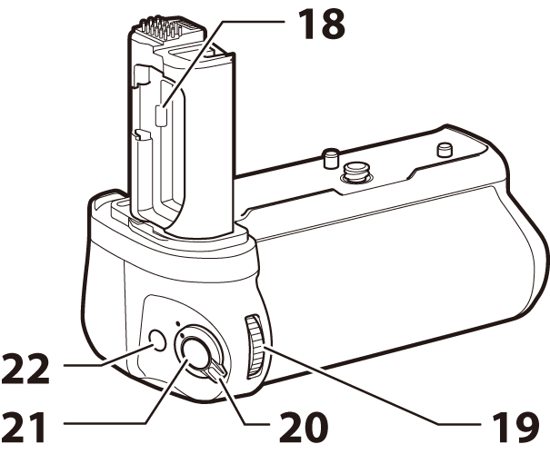| 19 | Vorderes Einstellrad für Hochformat | Funktioniert wie das entsprechende Bedienelement an der Kamera. Einzelheiten dazu finden Sie in der Dokumentation zur Kamera. |