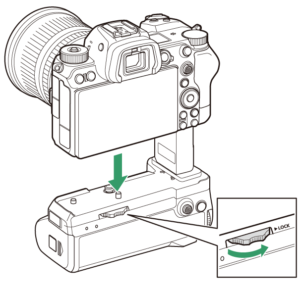 MB-N11を取り付ける前に、カメラの電源をOFFにしてください。また、取り付け中の誤操作を防ぐため、取り付けが完了するまでMB-N11のロックレバーをL(ロック)側にセットしてください。
