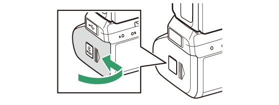 Aizveriet turētāja kameras vāku un nofiksējiet to, nospiežot un bīdot norādītajā virzienā.