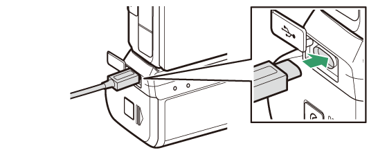 - Batteriene lades ikke hvis kabelen er koblet til kameraets USB kontakt mens MB-N11 er tilkoblet. Koble kabelen til MB-N11 ladekontakt.