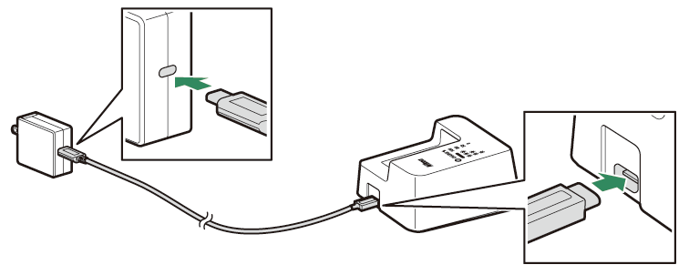 Connect the EH-7P charging AC adapter or the USB cable (featuring Type-C connectors at both ends) that is connected to the EH-8P AC adapter to the battery charger.