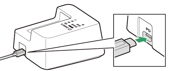 - Vous pouvez utiliser des adaptateurs secteur tiers pour recharger l’accumulateur de l’appareil photo. Utilisez un adaptateur secteur doté de connecteurs USB de type C et prenant en charge la norme USB PD (Power Delivery).