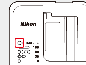 Indikators „CHARGE %” (UZLĀDE %) Statuss Atkārtoti iemirgojas vienu reizi un nodziest Uzlāde (uzlādēts mazāk par 50 %) Atkārtoti iemirgojas divreiz un nodziest Uzlāde (uzlādēts par 50 %) Atkārtoti iemirgojas trīsreiz un nodziest Uzlāde (uzlādēts par 80 %) Ieslēdzas Uzlāde pabeigta