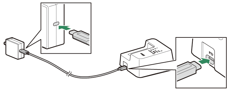 Do ładowania akumulatora możesz używać zasilacza sieciowego EH-8P i kabla USB (wyposażonego w złącza USB typu C na obu końcach) lub ładowarki sieciowej EH-7P. Kształt wtyczki różni się w zależności od kraju lub regionu zakupu.