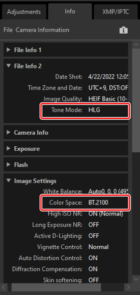 Panel [ Informácie o súbore 2 ] na karte s informáciami v palete úprav/informácií uvádza režim tónov ako „ HLG “, zatiaľ čo panel [ Nastavenia obrázka ] uvádza farebný priestor ako „ BT.2100 “.