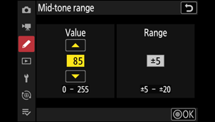 For Custom Setting g [Video] > [Zebra pattern] > [Mid-tone range], set [Value] to [85] and [Range] to [±5].