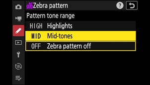 Select [Mid-tones] for Custom Setting g [Video] > [Zebra pattern] > [Pattern tone range] and press the center of the multi selector.