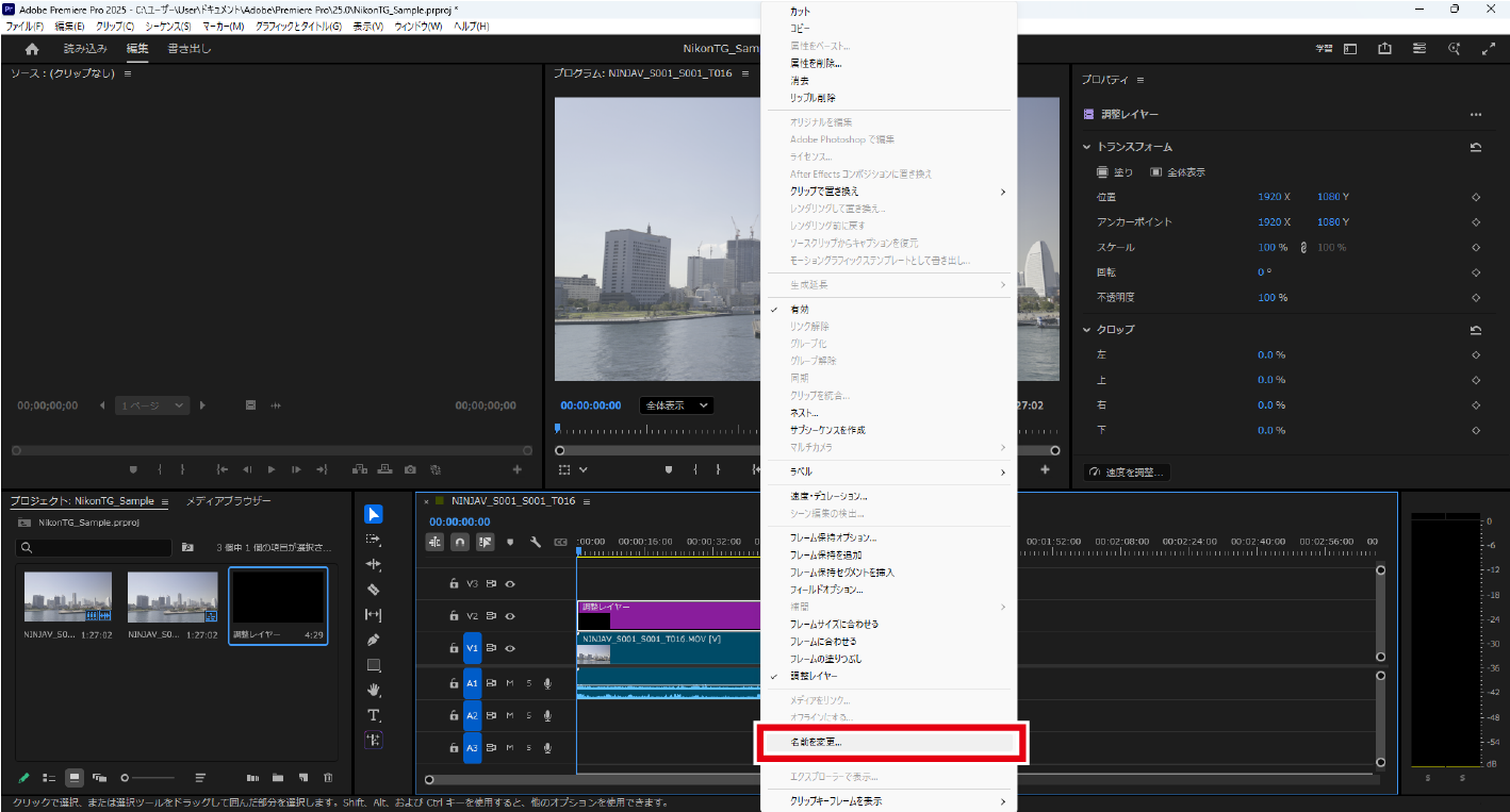 タイムライン上の調整レイヤーの上で右クリックし、[名前を変更]をクリックする
