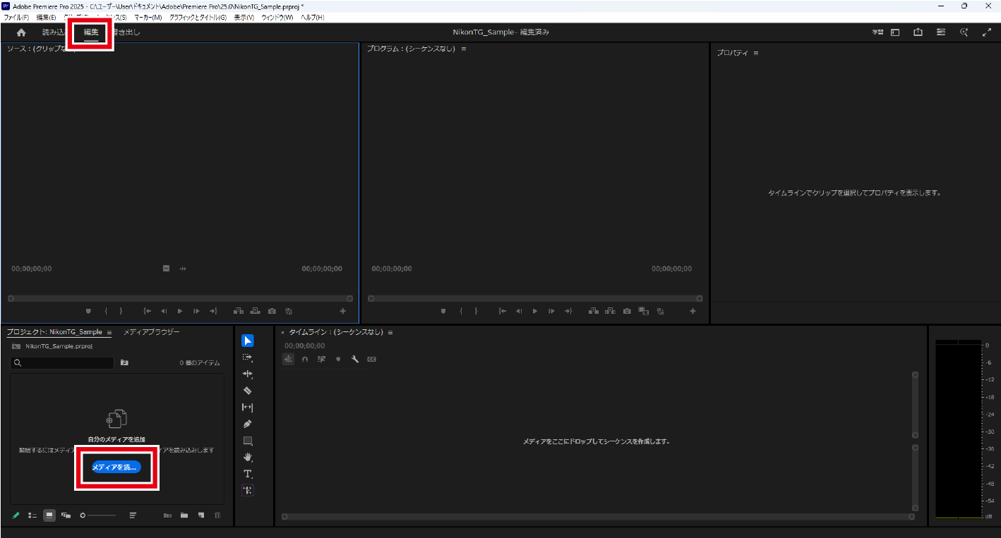 [編集]をクリックして表示される画面の左下にある、[プロジェクト]パネル内の[メディアを読み込み]から動画素材を読み込んでください。動画素材をドラッグ&ドロップしても読み込みできます。