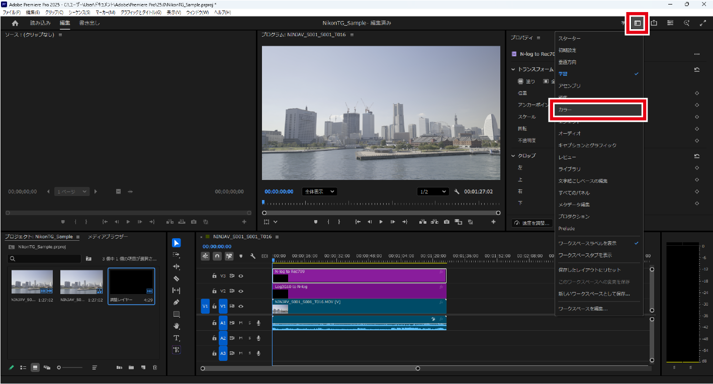 階調モードを[N-Log]に設定して撮影したN-RAWをPremiere Proで開くと、RED Wide Gamut(RWG)/ Log3G10が適⽤されます。ここでは、RWG/Log3g10 to Rec2020/N-Log LUT(以下、Log変換LUT)およびテクニカルLUTを使⽤したカラースペース変換の⽅法をご紹介します。