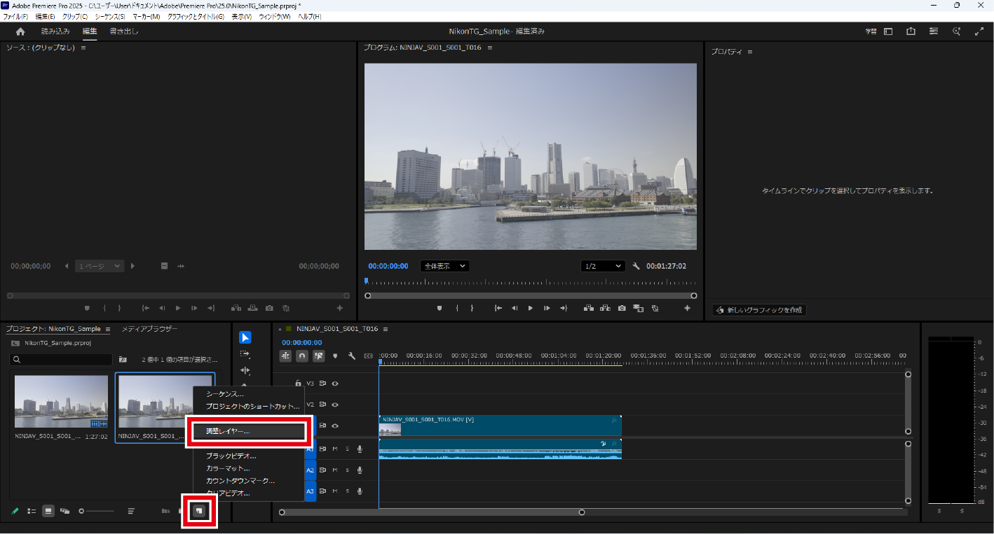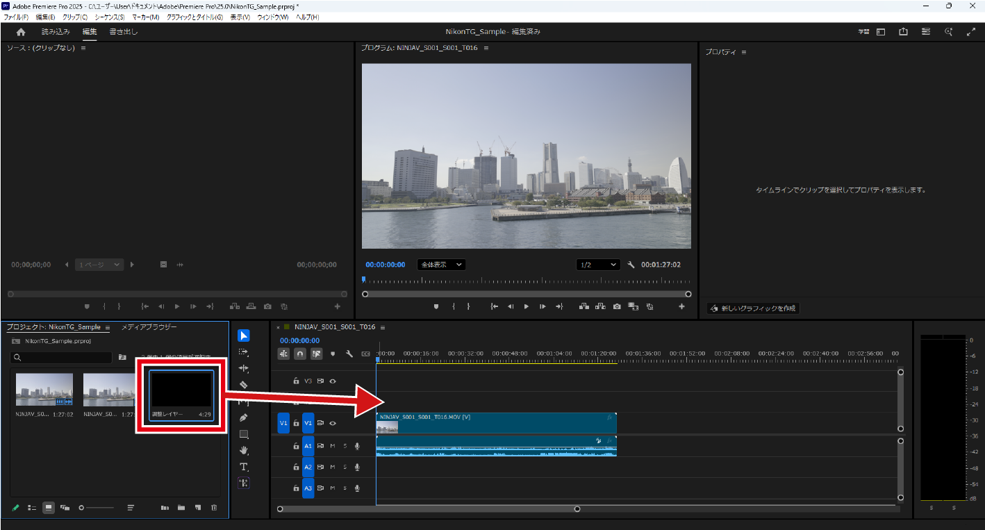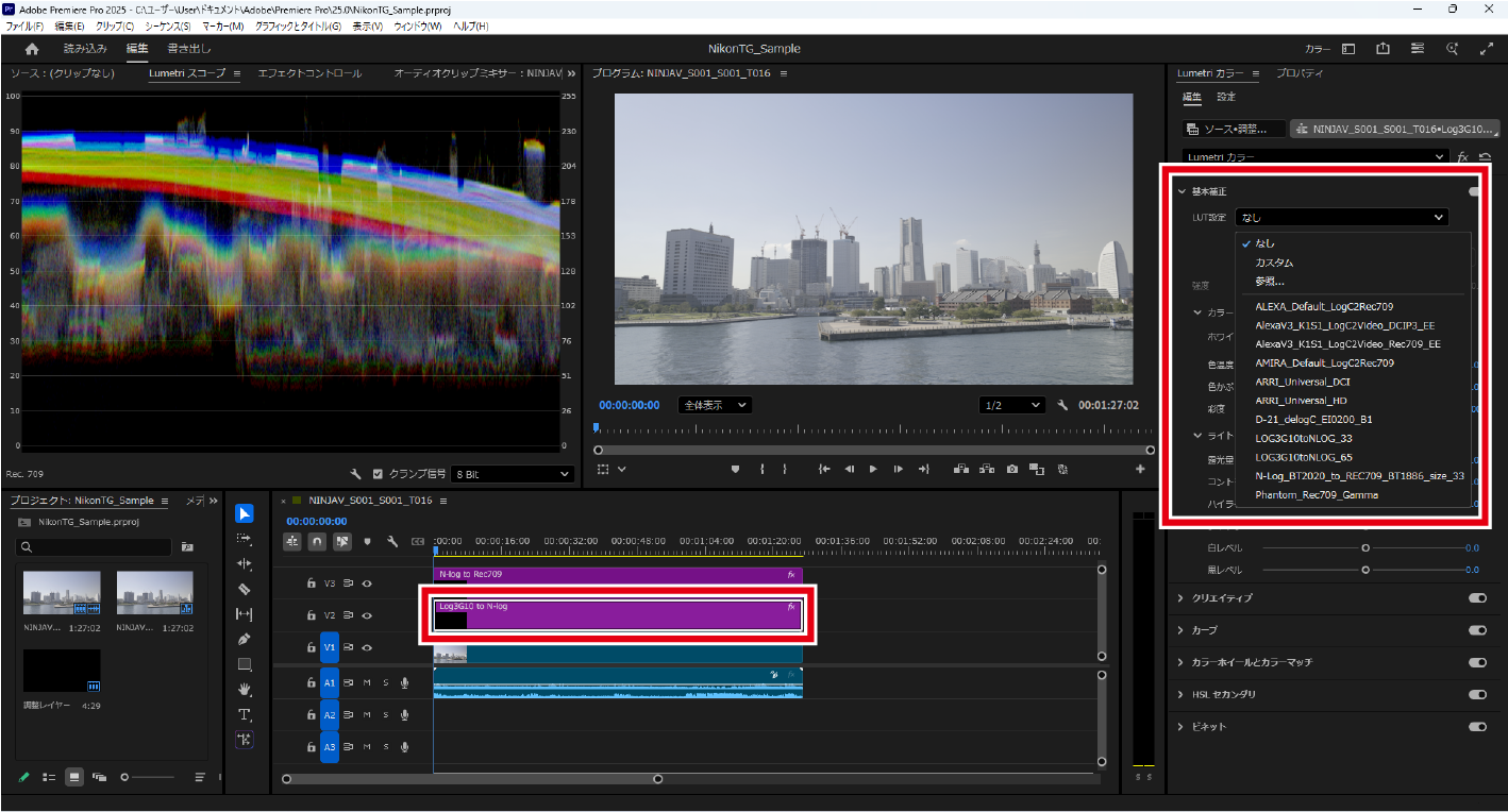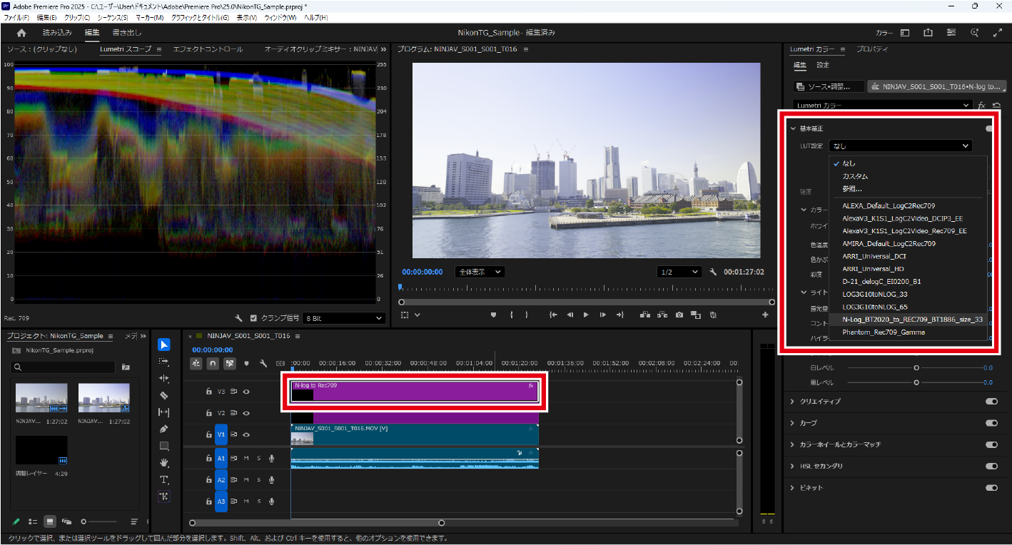 タイムライン上の調整レイヤー「N-log to Rec709」を選択し、[Lumetriカラー]パネルの[基本補正]>[LUT設定]からテクニカルLUTを選択します。