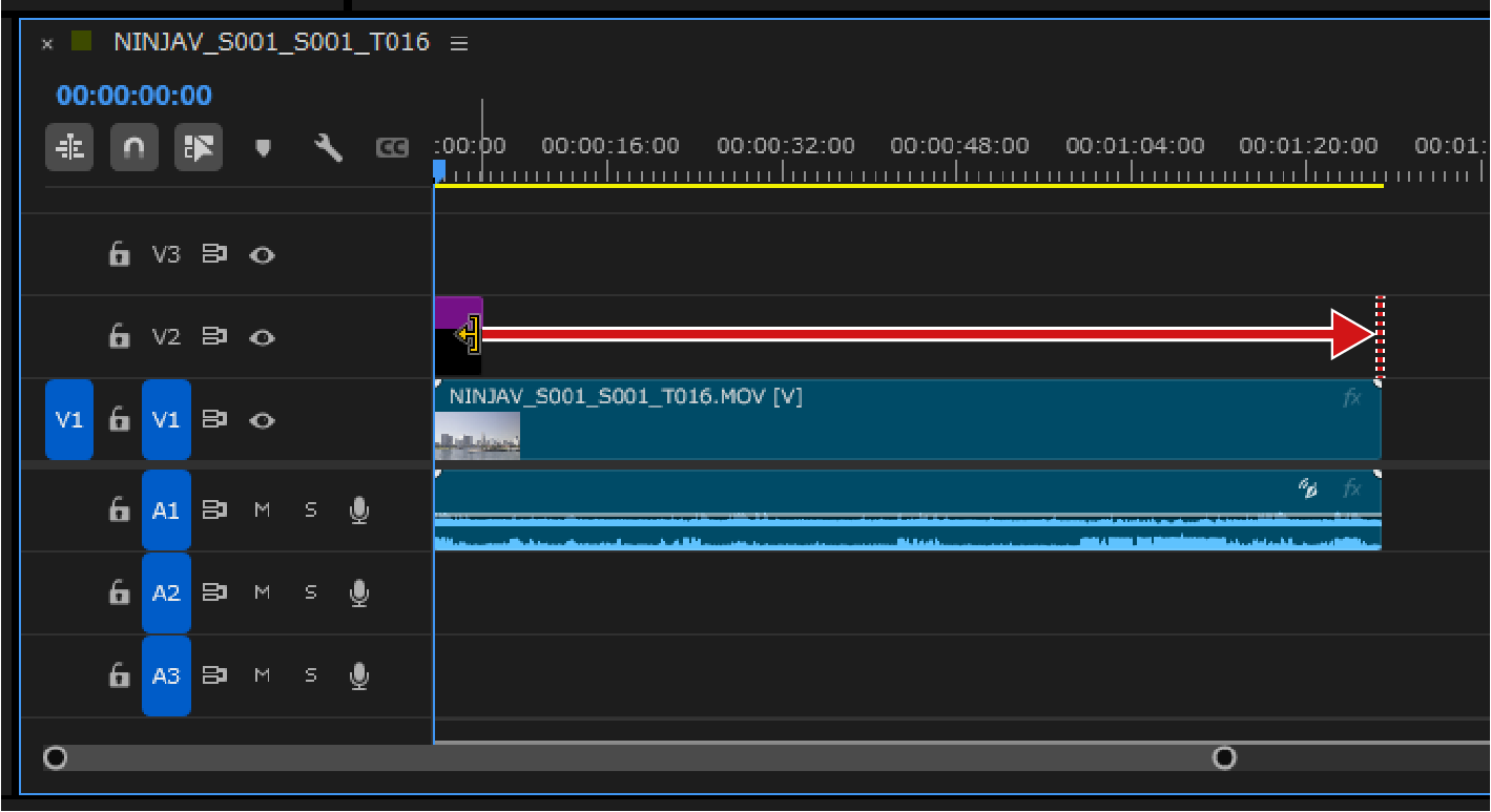 ドラッグ&ドロップした調整レイヤーの右端をクリックした状態で、動画素材と同じ長さになるまで引き延ばします。