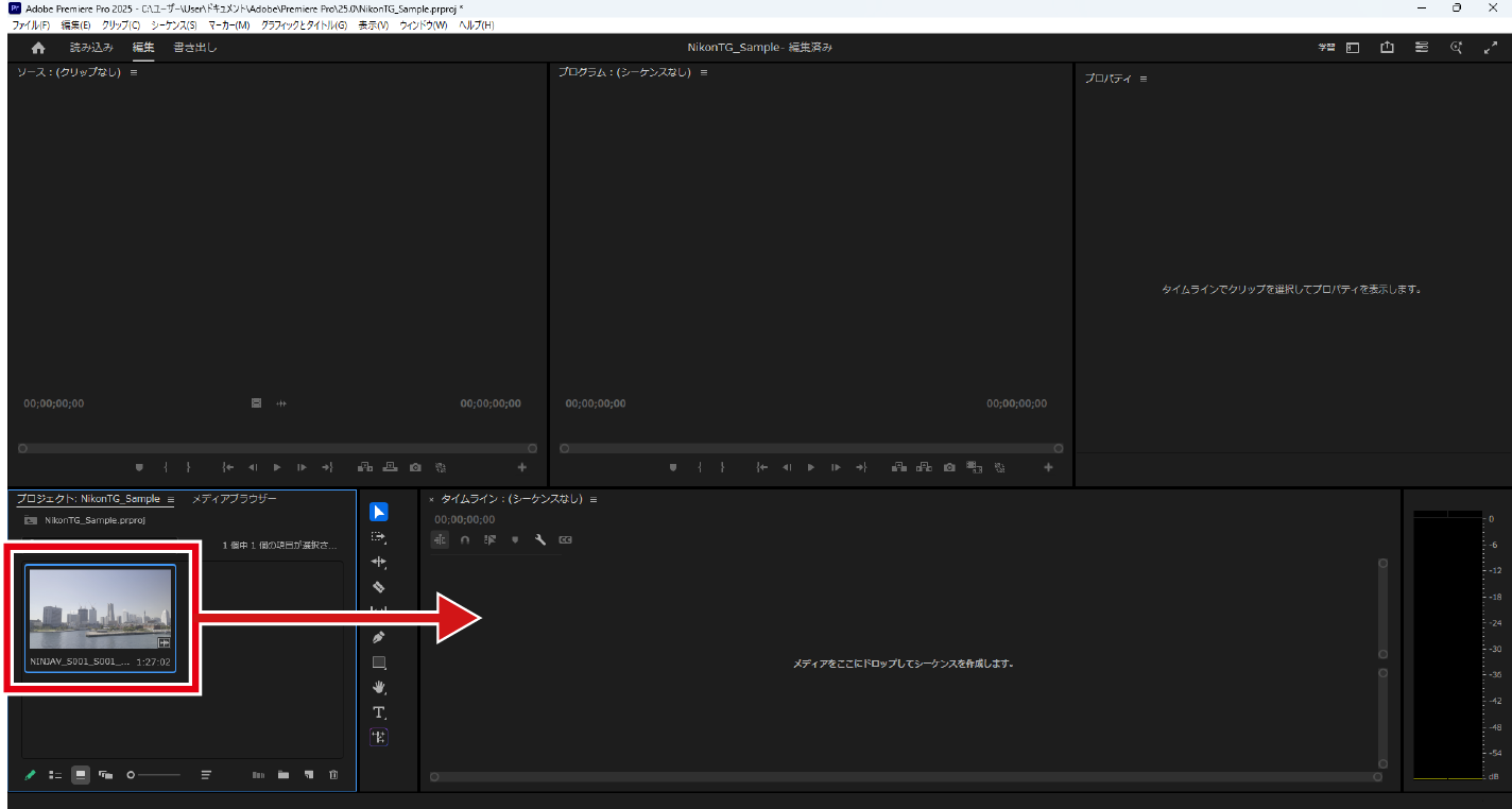 読み込んだ動画素材を[タイムライン]パネルにドラッグ&ドロップします。